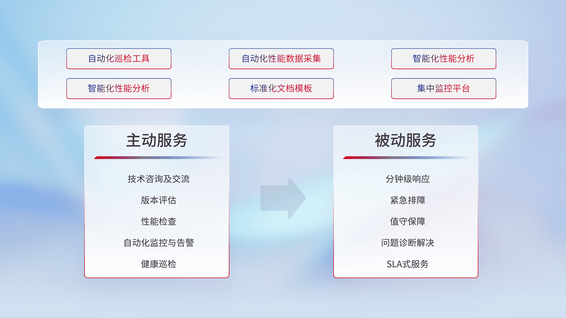 智能化工具和标准化文档,,保障服务质量,,,,提供主动服务(包含技术咨询、、版本评估、、、、性能检查、、、、自动化监控与告警、、、、健康巡检)和被动服务包含(分钟级响应、、、、紧急排障、、、值守保障、、问题诊断解决、、、SLA服务)。。