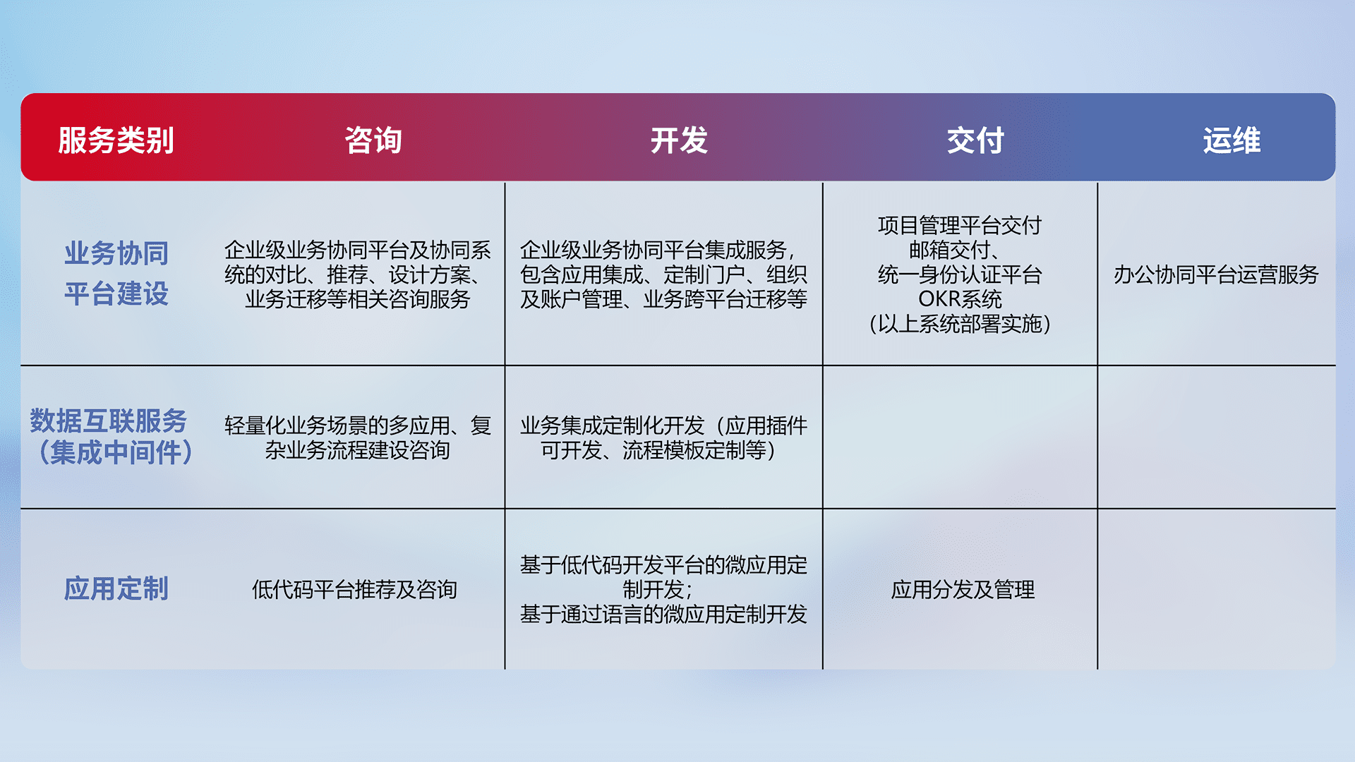 针对钉钉、、、、企微、、、、IDaas等平台级产品提供产品的规划、、、方案、、、交付、、定制化开发等服务,,,实现如统一协同办公、、、智能客户服务、、、、混合会议管理、、、、智能数据查询、、、等业务场景,,,实现数字化转型。。。
